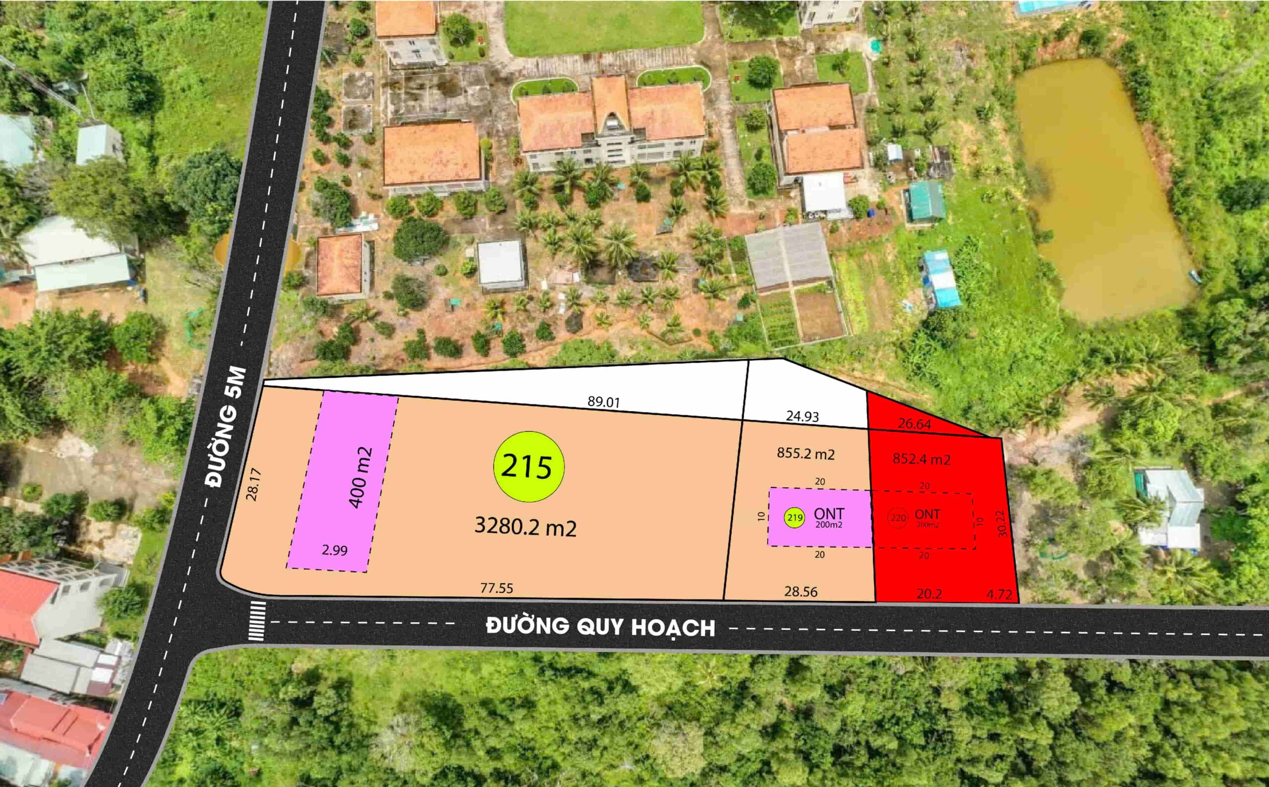 - 8 tr/m2 thửa đất 215 tờ bản đồ 22. Diện tích 3.280,4 m2 trong đó có 400m2 đất ONT, Ngoài sổ thêm 550m2 không tính vào giá. Sổ thể hiện đường, không dính dự án.